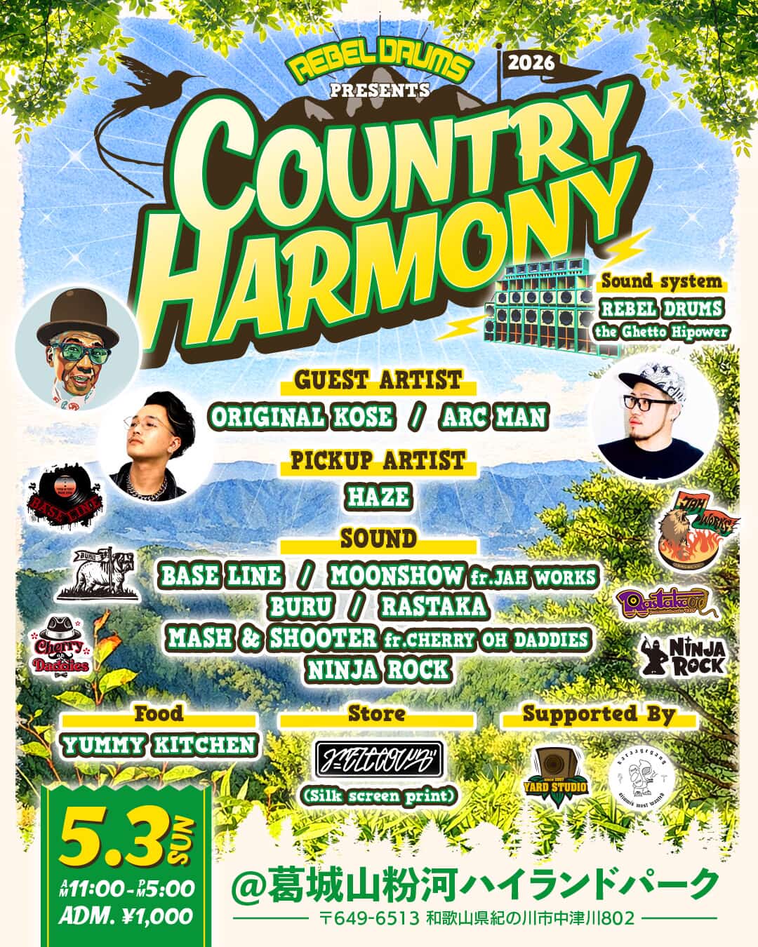 REBEL DRUMS PRESENTS.【COUNTRY HARMONY 2026】 5月3日日曜日am11:00~pm5:00ADM \1000@葛城山粉河ハイランドパーク(和歌山県紀の川市中津川802) ■GUES…